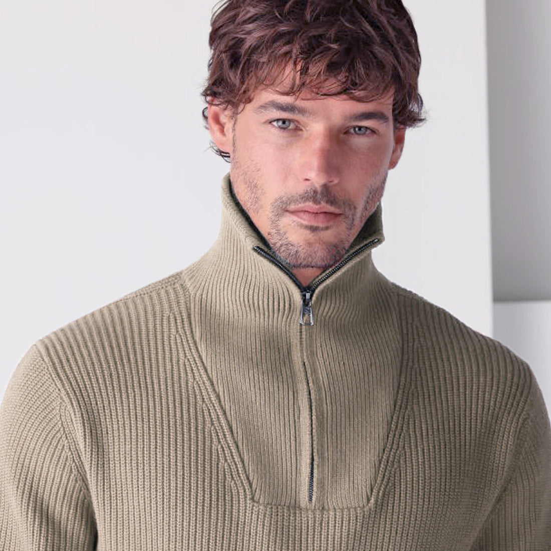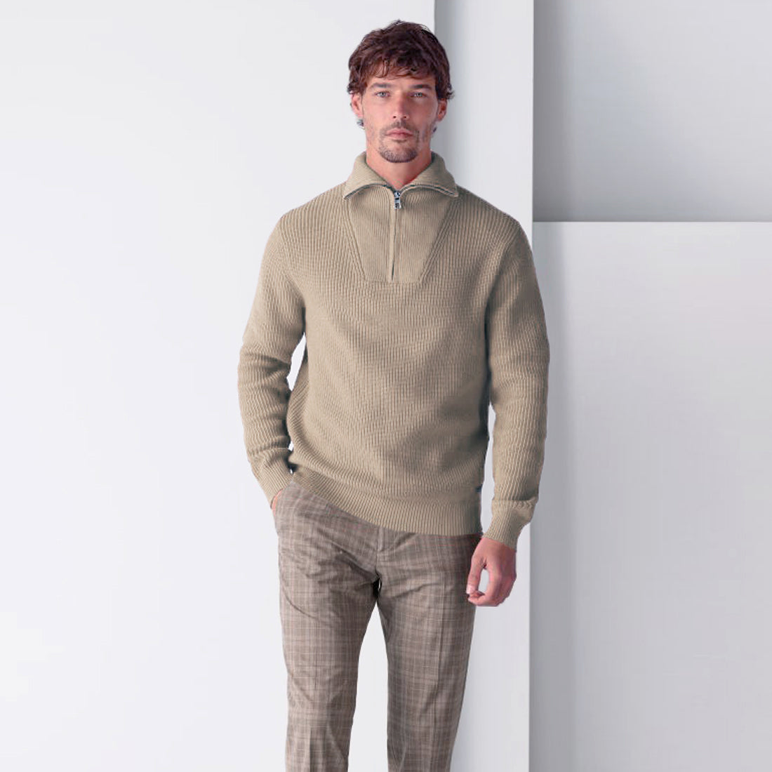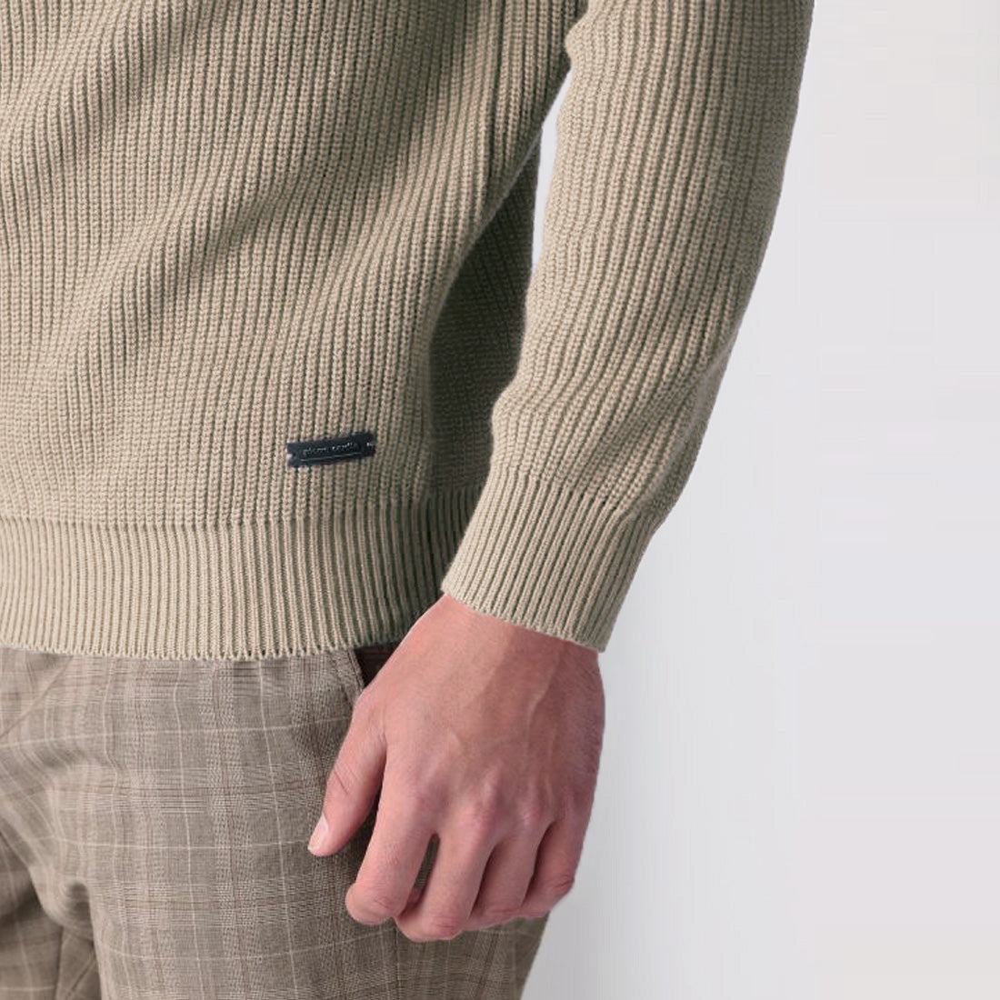 • pierre cardin futureflex luxor Modern-Fit vilagos drapp barna karcsusitott cipzaros galleros kotott egyfalu pamut bolyhodas allo alaktarto pamut pulover felso