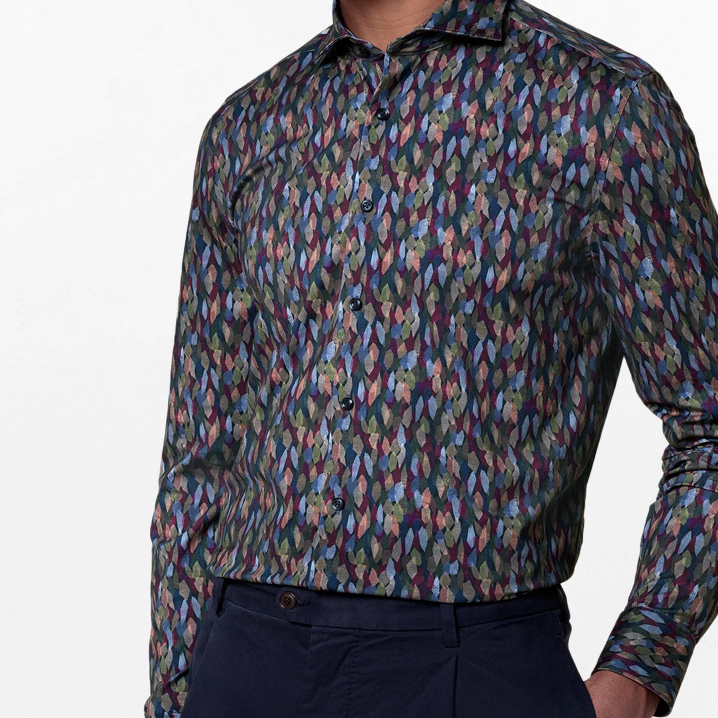 OLYMP Level 5 Body Fit 24/Seven Maldonado Színes Apró Virágmintás Sötétkék Selymes Extra Karcsúsított Vasalásmentes Jersey Ing 35.900 Ft