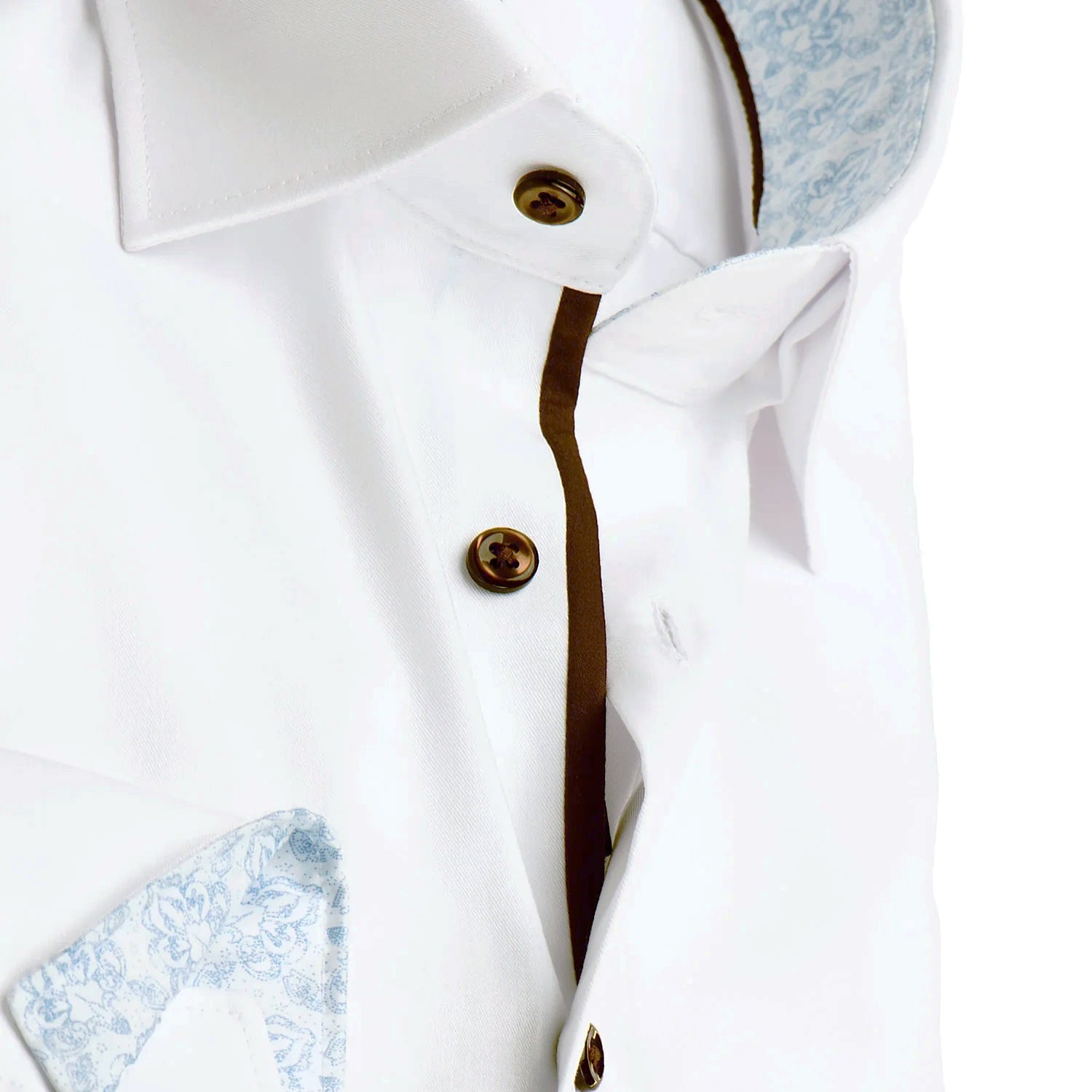 Elragadó összhatású, hosszú ujjú, közepesen karcsúsított, hófehér Olymp ing, szolid, égszínkék virágmintás belsőkkel a vasalásmentes Luxor kollekcióból. Az elütő, fényes barna gombok és mellettük párhuzamosan...
