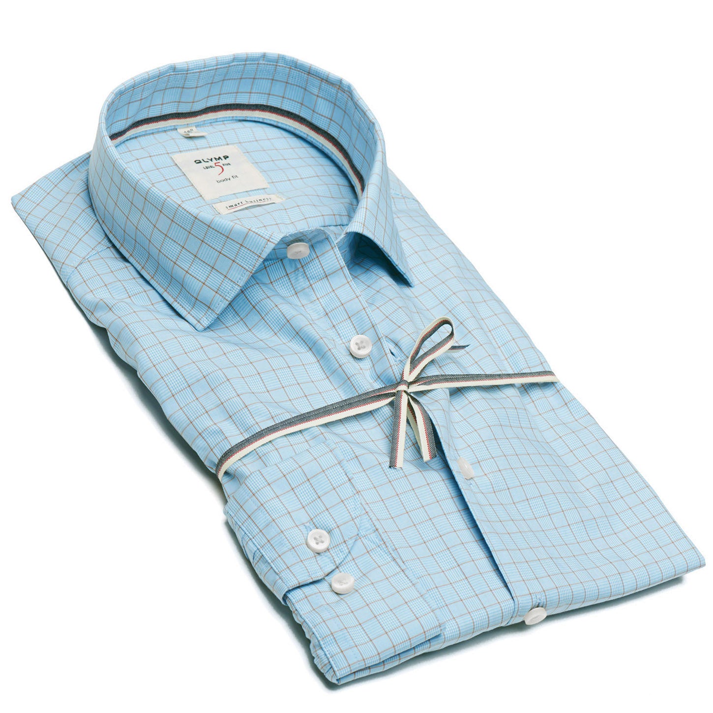 OLYMP Smart Business Level 5 Body Fit Richfield Világoskék Barna Tartan Kockás Extra KArcsúsított Tiszta Pamut Ing