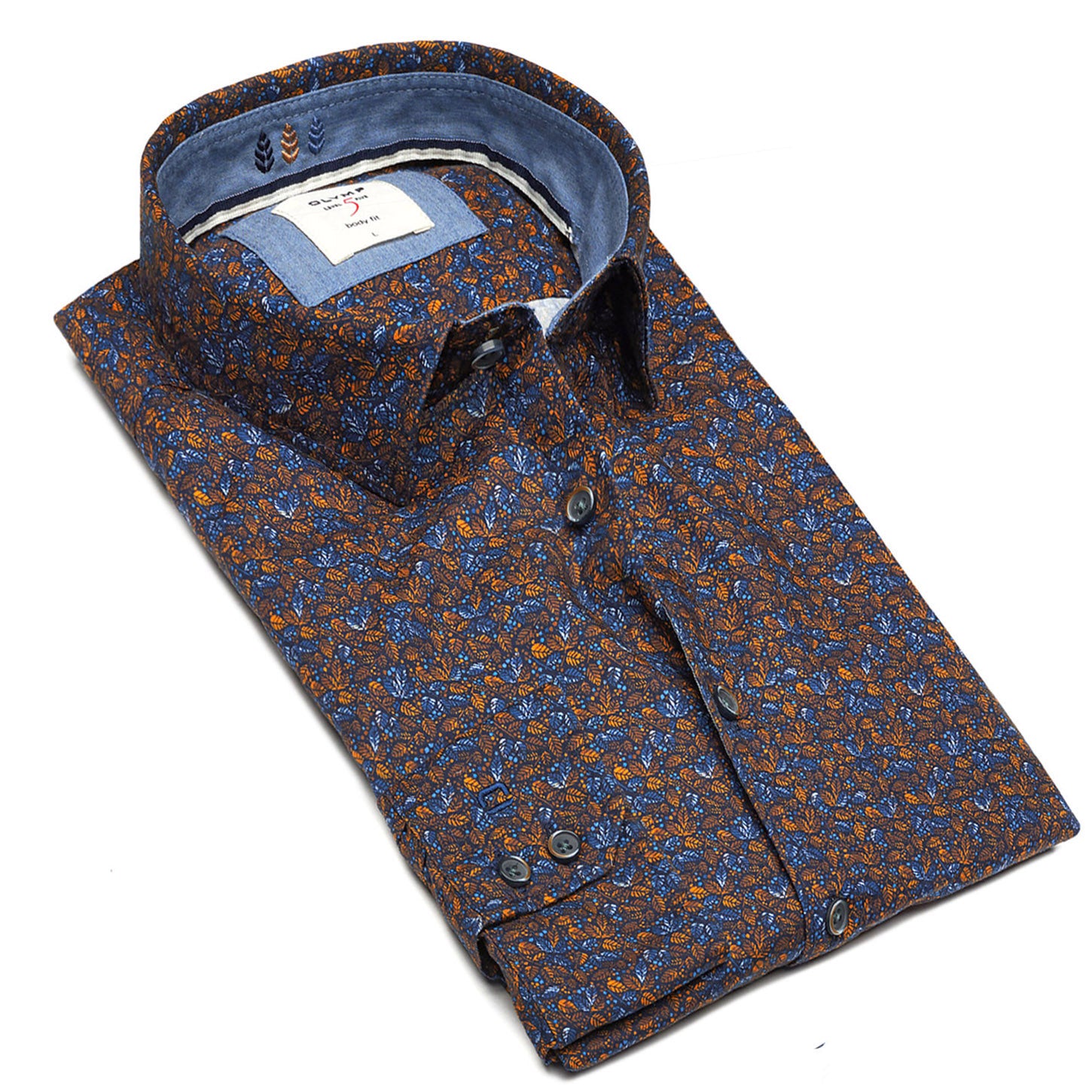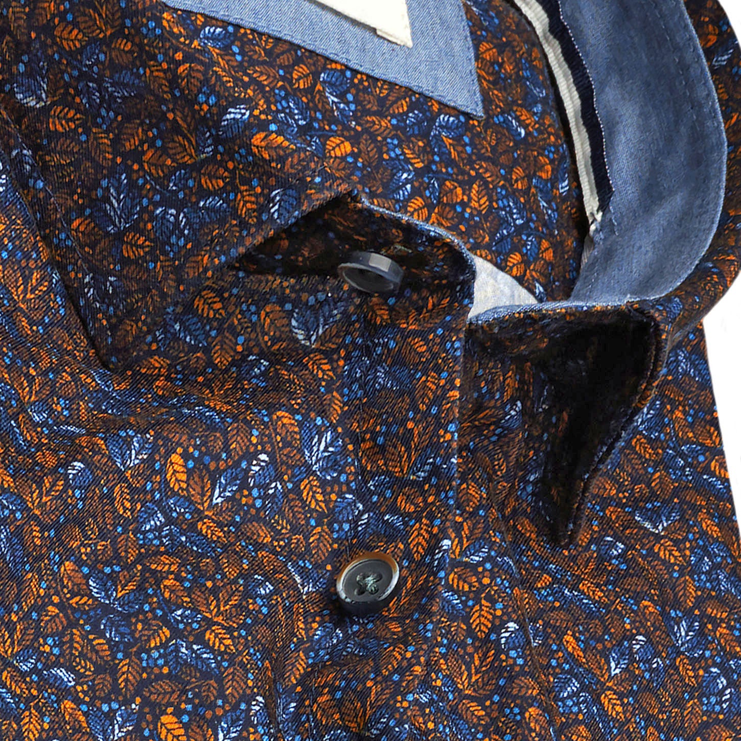 OLYMP Casual Level 5 Body Fit Williamson Rozsdás Arany és Kék Levélmintás Rendkívűl Finom Selymes Tapintású Karcsúsított Tiszta Pamut Ing