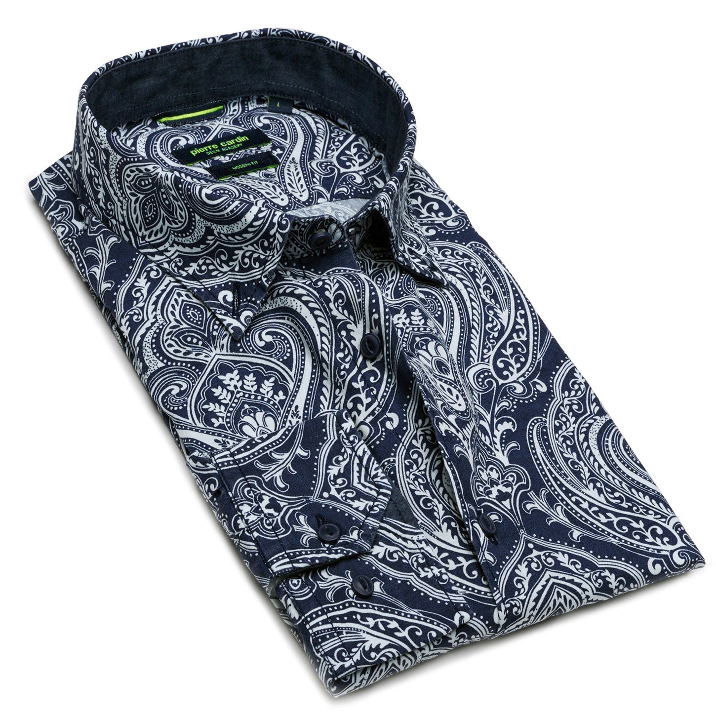 Erőteljes, hófehér paisley virágmintás, közepesen karcsúsított, sötétkék Pierre Cardin ing a fiatalos Denim Academy kollekcióból. A dekoráció tengerészkék, navy színárnyalata markáns összhatást kelt. Szenvedélyesen férfias...