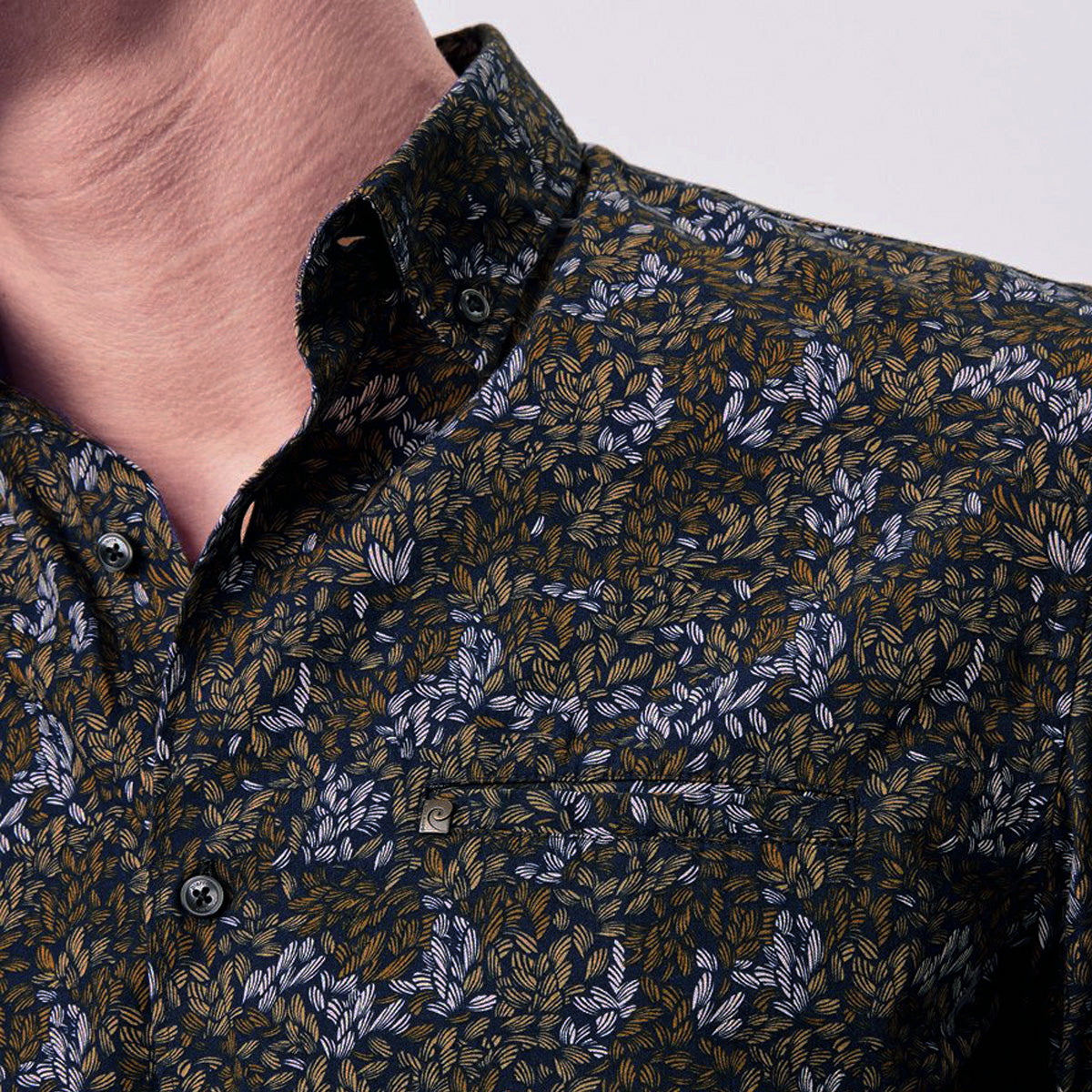 • pierre-cardin-modern-fit-futureflex-karcsusitott-levelmintas-sotet-kek-zold-felso-galleros-farmer-ferfi-ing-divatosan-elegans-alkalmi-58832-6930-9082-öltözködés-ruházat-falevél-barna-floral-sportos