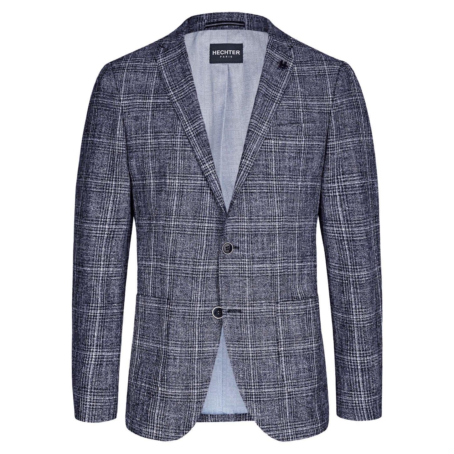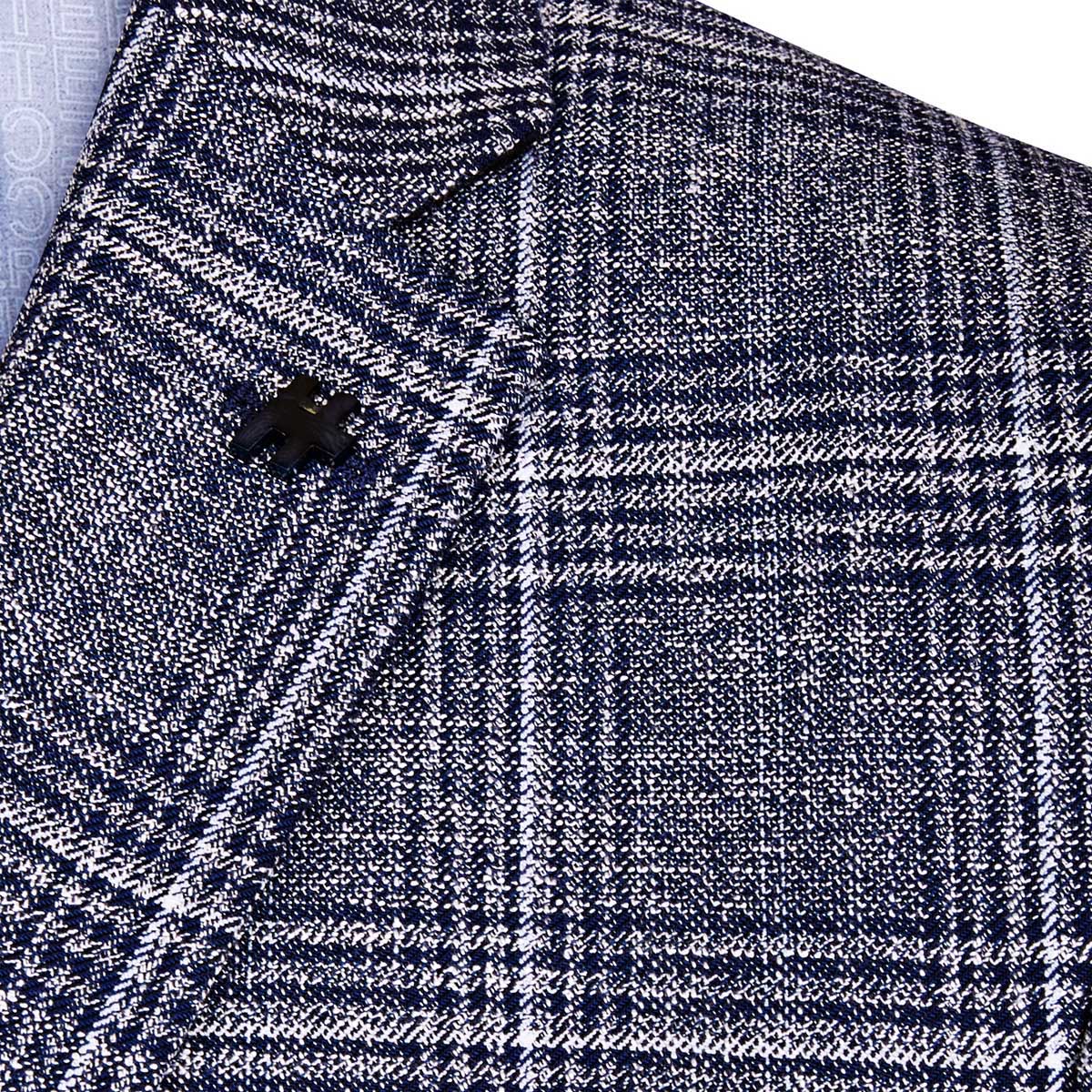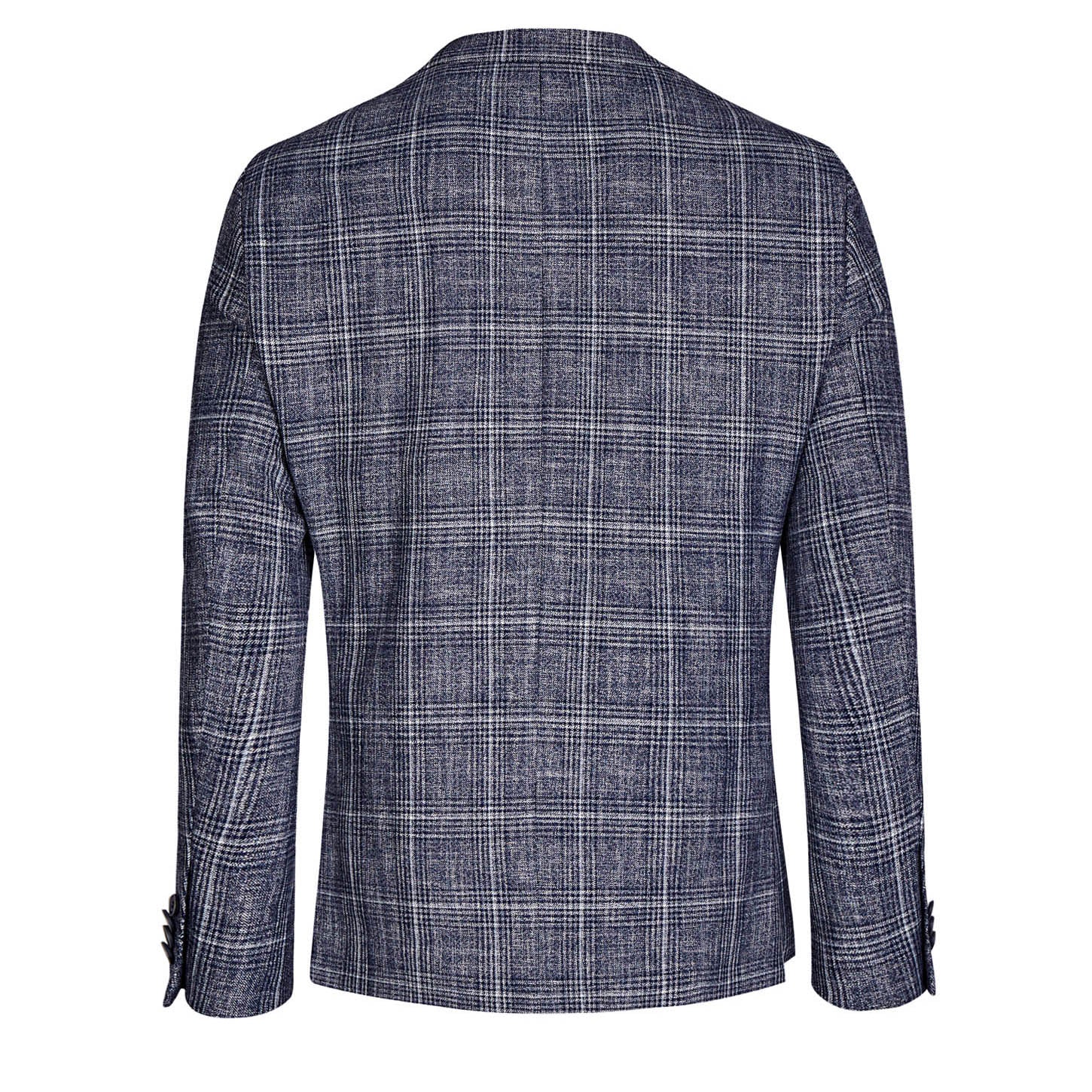 A dekoratív, madras négyzetrácsos mintázat textúrája elbűvölően férfias. A váltakozó sötétkék és fehér szálszövések sűrűjében, és a kivételes anyagösszetétel eredményeképpen enyhén fényes, ezüstös összhatással bír, kihangsúlyozva a zakóban rejlő alkalmiságot. Fehér inggel együtt igazán ünnepélyes, míg egy sötétkék garbóval vagy felsővel viselve ellenállhatatlanul sportossá válhatunk vele. Könnyedén koronázhatjuk meg öltözetünket segítségével, amihez ez a klasszikus, kétgombos, láthatatlan mell- és oldalsó sportos foltzsebeses, hátul kétoldalt sliccelt tervezés nyújt módfelett stílusos, sportos megjelenést.
