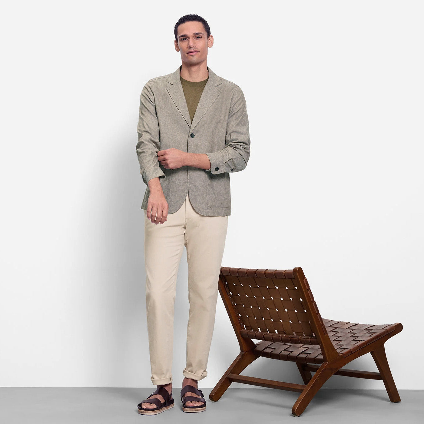 Sportos, mégis rettentően elegáns, hozzá tökéletesen illeszkedő foltzsebbekkel, illetve remek újításként, a dzsekiknél megszokott, kétgombos kialakítású mandzsettákkal. Széleskörben kihasználható darab zakók helyett a hétköznapok, üzleti és kötetlen alkalmak során egyaránt. A blazer stílusához remekül illeszkedő, csupán enyhén karcsúsított casual modern fit szabás nyújt makulátlan megjelenést, lehetővé téve az erősebb adottsággal bíró férfiak számára is a kényelmes, szabad mozgást anélkül, hogy túlságosan bő fazonú lenne.